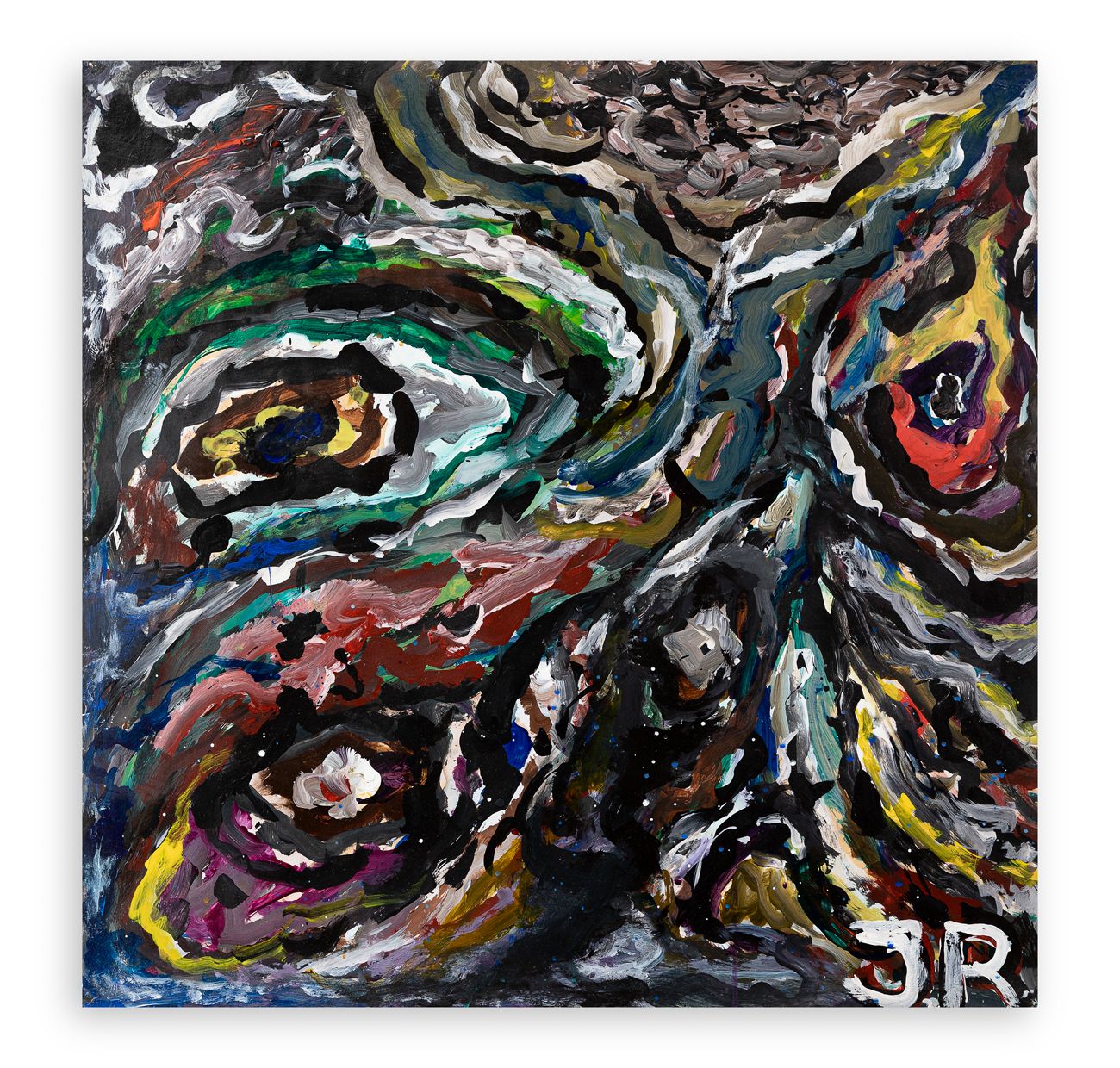 Aucune de ces compositions d'éléments hétéroclites mais reconnaissables qui font l'hybridité du dragon ou de la sirêne. Les êtres peints par Jean Raine seraient anamorphiques, déformés par le tableau/miroir. Ils sont les produits d'un acte de déformations de la vision. Elle reconduit à la dimension tragique du travail de l'artiste qui s'exprimait précédemment dans la vision des masques. AP
